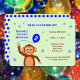 Cette invitation de fête de 2e anniversaire a un mignon singe souriant tenant un ballon bleu 2e anniversaire. "Aidez-nous à célébrer !" Tout le texte est modifiable, il suffit de taper les détails de votre partie dans les zones de personnalisation. L'arrière - plan de la carte est vert pâle, et il y a quelques étoiles parsemées de bleu, vert et blanc. Au fond, un motif à pois bleu avec une seule étoile au centre.