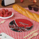 Cheerleader in dunkelrot, weiß und schwarz pappteller