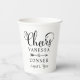 Hochzeitspapier-Party-Becher verfügen über schicke schwarze Schriftzeichen "Cheers" mit Pfeil-Monogramm-Design, die mit den Braut- und Bräutigamen und dem Hochzeitstag personalisiert werden können.