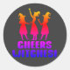 Geben Sie diese lustigen Halloween-Aufkleber für Trick oder behandeln Sie diesen Halloween. Dieses festliche Design mit schwarzem Hintergrund und drei farbigen Hexen mit Toast. Der unten inspiriert Retro-Text lautet "CHEERS WITCHES!" in fett gedruckten Buchstaben.