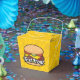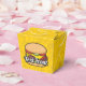 Darstellung des Cartoon von Cheeseburger. Junk Food Kontur Icons Gelbe Muster Hintergrund. Benutzerdefinierter Text auf beiden Seiten.