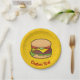Darstellung des Cartoon von Cheeseburger. Junk Food Kontur Icons Gelbe Muster Hintergrund. Eigener Text.