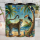 Dieses lebendige, künstlerische Bild besticht durch eine Geparde mit einem extra langen, gestreiften Schwanz, der an einem sonnigen Strand stehend ist. Die Geparden sind von üppigen Palmen und tropischen Pflanze umgeben, und zwei Tukane stehen auf einem Baum. Der Hintergrund umfasst das Meer mit abstürzenden Wellen und einen blauen Himmel mit fliegenden Vögeln, die eine verspielte, tropische Szene schaffen.
