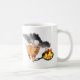 Un chat orange vêtu d'un casquette cuisinier tient une poêle flamboyante sur cette drôle de tasse de cuisine.