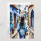 Diese Postkarte zeigt ein Aquarellbild einer Frau, die eine Gasse in Chefchaouen, Marokko, entlang geht.