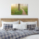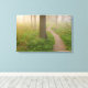 Impression en toile d'un sentier de marche à travers des muqueuses menant dans une forêt au lever du soleil, un matin brumeux, créant une atmosphère magique.