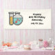Geburtstagsbanner mit einer niedlichen Abbildung eines Reagenzglases mit gelber Flüssigkeit und einem abgerundeten Kolben/Becherglas mit grüner Flüssigkeit mit roten Blasen.