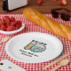 Teller aus Papier mit einer niedlichen Abbildung eines Reagenzglases mit gelber Flüssigkeit und einem abgerundeten Kolben/Becherglas mit grüner Flüssigkeit mit roten Blasen.