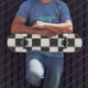 This design features a black-and-white chequered flag that is typically used in motor racing to indicate the finish. The flag is often associated with the winner of a race, since they are the first to drive past the chequered flag. The pattern can also be seen as influenced by a checkerboard, which is used to play strategy games such as chess.