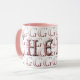 Weiße Tasse, "CG"-Initialen in wiederholtem Lichtgradientenrosa, "Cherie" Vordergrund, rosa Griffe und innerer Trinkbereich.