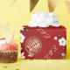 Dieses Papier mit einem blühenden Zweig aus Schwarz-Weiß-Kirschen, doppelten Glückssymbolen aus Gold und Bräunungs- und Bräutigam-Initialen auf einem glänzenden roten Hintergrund.