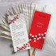 Mit diesem kühnen Kirschblütenmenü präsentieren Sie Ihre Empfang-Auswahl stilvoll. Die weiße Vorderseite ist mit roten Kirschblüten, einem schwarzen Zweig und schwarzem Text versehen, wobei die Namen der Paare rot hervorgehoben sind. Der rote Rücken, mit weißen Kirschblüten und einem schwarzen Ast geschmückt, bietet einen atemberaubenden Kontrast, der perfekt für eine moderne und anspruchsvolle Hochzeit geeignet ist.
