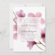 Elegante und moderne Blumen-Hochzeitseinladung mit einem Hintergrund von weichen rosa Aquarellkirsche blühenden Blume. Ihre Hochzeitsdetails werden auf einem schieren weißen Element in eleganter grauer Schrift überlagert, die mit handgeschriebenem Kalligrafieschrift versehen ist.