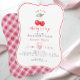 Célébrez votre petit bonbon sur le chemin avec cette charmant invitation Cherry sur Top baby shower. Doté de cerises rouges à l'aquarelle, d'une typographie ludique et d'un en vichy rose, ce design allie style rétro classique et modernité. Parfait pour une douche pour fille, il donne le ton pour une fête joyeuse et amusante. Personnalisez avec vos détails de fête pour une touche unique que vos invités aimeront.