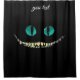 Ein geheimnisvolles Design mit leuchtenden grünen Katzenaugen und einem breiten, unheimlichen Lächeln auf dunklem Hintergrund.