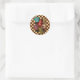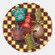 Runder Aufkleber mit Schachdesign mit Vektorgrafik des Königs, der Königin, des Bischofs, des Ritters, des Rooks und der Pawn gegen ein braunes und gelbes Schachbrett.