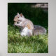 A squirrel is sitting in a grassy area, nibbling on something with its tiny paws. The sunlight highlights its fur against the dark green background.