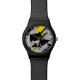 Karo aus Chibi Batman macht einen fliegenden Tritt vor einem blitzförmigen Hintergrund.
