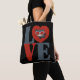Karo aus Chibi Catwoman in einem roten Herz, das das "O" in diesem "LIEBE" gestapelten Logo darstellt.