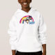 Karo vor Chibi Supergirl, Chibi Wonder Woman und Chibi Batgirl vor einem Regenbogen, der sich von einem blauen Gerechtigkeitsliga-Logo erstreckt.