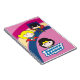 Karo vor Chibi Supergirl, Chibi Wonder Woman und Chibi Batgirl vor einem Regenbogen, der sich von einem blauen Gerechtigkeitsliga-Logo erstreckt.