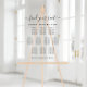 Chic klares Acryl Hochzeitszeichen für bis zu 10 Tische mit "finden Sie Ihren Sitz" in einem stilvollen Skript mit Swashes, Ihre Vornamen und Hochzeitsdatum verbunden mit einem Herz und "Wir sind so froh, dass Sie hier sind" in klassischer Serif-Typografie.