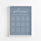 Chic downloadable dusty Blue Hochzeitsstempelposter für bis zu 12 Tische mit "welcome" in einem stilvollen weißen Skript mit Swashes, "Find Your Seat" in eleganter weißer Typografie und Ihre Namen und Hochzeitsdatum durch ein Herz verbunden. Mit der Option zum digitalen Download können Sie Änderungen in letzter Minute bearbeiten und lokal drucken.