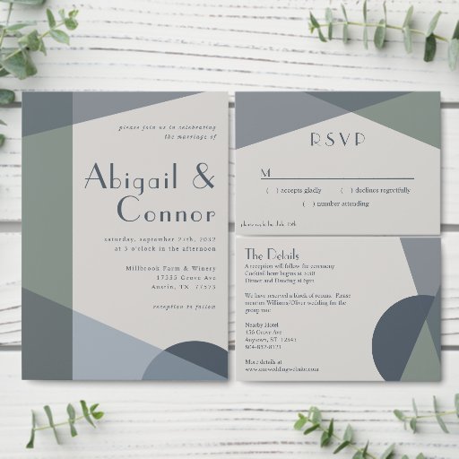 Elemente: abstrakte geometrische Formen, Farbblöcke, schicke serifenlosen Schriftart für Namen, Schriftart für Details mit unterformatierten Serifen. Farben: Salbei, Minze, Pistazien, immergrün, staubblau, botanisch, Marine, Abend, Mitternacht, Cetacean, Pergament, hellgrau, Platin. Themen: modern, minimalistisch, abstrakt, sauber, fröhlich, cool, untertönt, boho, skandi, zeitgenössisch, industriell. Sammlung: Chic Abstrakt Geometric Sage Navy Dusty Blue Wedding Collection Produkttyp: Menü
