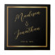 Diese personalisierte, moderne Hochzeitskachel zeigt die Namen der Braut und der Zelter und das Hochzeitsdatum in handgeschriebenen Imitaten Goldschrift auf einem einfachen schwarzen Hintergrund. Ein einzigartiges Geschenk für frisch verheiratete Kinder. Entworfen von Susan Coffey.