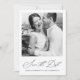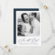 Élégante calligraphie et dos de carte photo bleu foncé pour carte de mariage save the date.