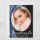 Schicken Sie Ihre Familie und Freunde diese 2021 chic Glitzer und Glam benutzerdefinierte Foto Abschluss-Ankündigungskarte, um sie zu wecken. Dieses moderne Template-Design bietet Ihnen ein Foto, um auf Ihr eigenes gerahmte in Imitaten Rose Gold Glitzer mit einem Rand von blau und Rose Gold agate abstrakte Kunst auf der links und schwarz auf der rechten Seite. Unter Ihrem Foto steht "Graduate" in eleganter Schrift Typografie mit Ihrem Namen, der Schule und dem Jahr zum Personalisieren. Entworfen von Susan Coffey.