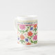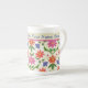 Eine schicke Knochen-China-Tasse zum Personalisieren, mit einem farbenfrohen Muster aus rosa und orangefarbenen Blume und Polka Dots auf einem blattstrukturierten Ecru-Hintergrund. Als Teil der Posh & Painterly 'Rangoli' Kollektion kann dieses Muster an jede Tasse angepasst werden.