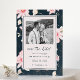 Eine schöne Blütenhochzeit in Rosa und Rosa bewahrt die Dattelkarte auf einem dunkelblauen Hintergrund mit einem botanischen Muster zarter rosa Blume. Hübsche Save the Date Kalligraphieskripte und ein volles Foto runden dieses moderne Ankündigung Datum freihalten ab.
