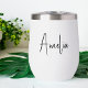 Chic personalisierter Thermalweintumbler, der Ihren Namen mit Monogramm in einem stilvollen Kalligrafieschrift zeigt. Erleben Sie Ihre Glaswaren oder überraschen Sie Ihre Mutter, Schwester, Freunde, Brautmädchen, Brautparty- und Junggeselinnen-Abschied-Gäste und andere Lieben mit einem nachdenklichen und eleganten Geschenk. Falls erforderlich, bearbeiten Sie das Entwurfstool, um die Skriptgröße für längere oder kürzere Namen zu erhöhen oder zu verringern.