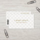 Diese elegante Visitenkarte bietet einen hellen, karierten Hintergrund mit Goldtext. Fügen Sie Ihren Firmennamen und Ihre Tagline an die Vorderseite des Gebäudes mit einem eleganten serif Schriftart. Ihre Geschäftsadresse und Kontaktinformationen, einschließlich Social Media und Icons, und QR Code auf der Rückseite. Ideal für persönliche Marken, Boutiquen und mehr.