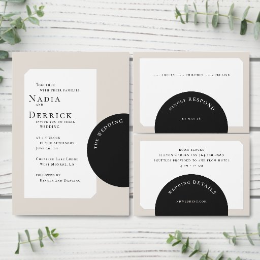 Ein einfacher Kreis mit gekrümmtem Text überschneidet die Details der Hochzeit.