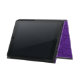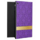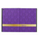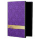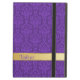 Elegantes Gehäuse aus iPad Air, mit eingebautem Ständer, in einem hübschen lila lila Damast-Muster. Die Grafik des goldenen Tonbändchens, ganz unten, hat einen lila Text, der individuell angepasst werden kann.