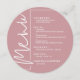 Eine rund staubige Rose-Dinner-Karte bietet Ihnen die Speisekarte in elegantem, weißem Schriftzeichen, ideal für einen modernen Hochzeitsempfang, ein Hochzeitsessen, ein Jubiläum-Party oder ein besonderes Dinner. Lassen Sie sich einfach mit Ihren Dinner-Optionen und Details persönlich verwöhnen. MEHR Farben in unserem Geschäft.