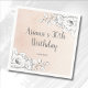 Chic blush rosa Wasserfarben Hintergrund, mit zartem Dekor, und moderne skizzenhafte Einrichtung mit weißer Blüte an der oberen rechten Ecke und unten links Ecke. Chic Schriftart Kombination aus eleganter Kalligraphie und Serifentypografie auf Holzkohle für die Geburtstagsdetails.