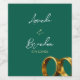 A bold and elegant wedding layout featuring a rich emerald green background with golden wedding rings in the bottom corner. A sophisticated and timeless design, perfect for classic and formal ceremonies.