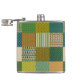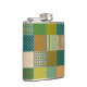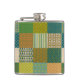 Un Hip Flask chic, avec un Faux Patchwork motif de motifs, bandes et pois tribaux en vert, rouge rouillé, bleu marine et or ancien ; de la collection Posh & Painterly "Jungle Drums".