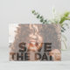 Ihr Foto mit einem SAVE THE DATE transparenten Overlay auf der Vorderseite und Ihre Graduierungsparty lädt mit einem neuen oder demselben Foto auf der Rückseite zu Details ein.