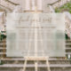 Chic mariage tableau de sièges en acrylique gelé pour jusqu'à 12 tables avec "trouver votre siège" dans un élégant script en or avec des swashes, vos noms et la date mariage réunis avec un coeur et "Nous sommes si heureux que vous êtes ici" en lettres d'or simple.