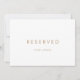 Dieses schicke goldene Typografie vorbehaltene Zeichen ist perfekt für eine moderne Hochzeit. Die Karte ist zweiseitig (beidseitig gedruckt). Das einfache Design besticht durch klassisch minimalistische Gold- und Weißtypografie mit einem rustikalen Bohhustengefühl. Anpassbar in jeder Farbe. Behalt das Design minimal und elegant, wie es ist, oder personalisiere es durch Hinzufügen von eigenen Grafiken und Kunstwerken. Benutzen Sie diese Karten, um Stühle oder Tische bei Ihrer Hochzeitsfeier, Empfang oder jeder Veranstaltung zu reservieren.