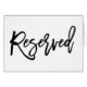 Geklapptes "reserviertes" Zeichen mit einem modernen Pinselskript-Schriftart in Schwarz auf einer gefalteten Karte.