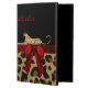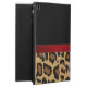Stilvolle iPad Air-Hülle, mit eingebautem Ständer und Grafiken eines gepunkteten braunen und schwarz gefärbten Jaguar-Pelzmusters, unten, mit einem soliden schwarzen auf der Oberseite, des Gehäuses. Die Grafik eines rot-satinierten Bandes verläuft in der Mitte und hat einen hübschen roten Bogen, rechts. Die Grafik einer wilden gepunkteten großen Katze scheint über das Band zu liegen. Personalisieren Sie den roten Text. Dies ist eine hervorragende Geschenkidee.