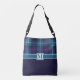 Chic Kariert Tartan Custom Monogram Script Wedding Crossbody Bag Moderne, elegante und trendige, anpassbare Tasche mit "personalisiertes Monogramm" auf einem keladon blauen / dunkelblauen karierten tartan Hintergrund. Personalisieren Sie diese schöne Tasche als ein wunderbares Geschenk für eine Braut, Brautjungfrau, Lehrerin, Freundin oder ein Mitglied Ihrer Familie, indem Sie Ihre Monogramm / ändern Sie den Schriftart, Farbe, Größe und Position.