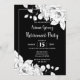Der elegante und moderne schwarze Hintergrund ist mit feinem, modernem, weißem Blumenmuster dekoriert und befindet sich in der rechten oberen und unteren links Ecke. Chic Schriftart Kombination aus eleganter Kalligraphie und Serifenblauer Typografie für die Details der Party Einladung in den Ruhestand. Die Rückseite der Einladung zeichnet sich durch die gleichen Blumenarrangements mit einer eleganten schwarzen Holzkohle und weißen Medaillons-Monogramm aus.