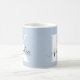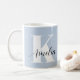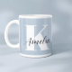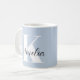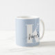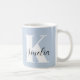 Personalisierte hellblaue Tasse mit dem Monogramm-Initial in der modernen großen weißen Typografie und Ihrem Namen in einem stilvollen Signaturskript.