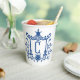 Diese chic pagoda Monogramm Becher sind perfekt für Unterhaltung und machen ein ausgezeichnetes Geschenk für die Gastgeberin. Die Pagode und das Monogramm sind in Marineblau auf Weiß.